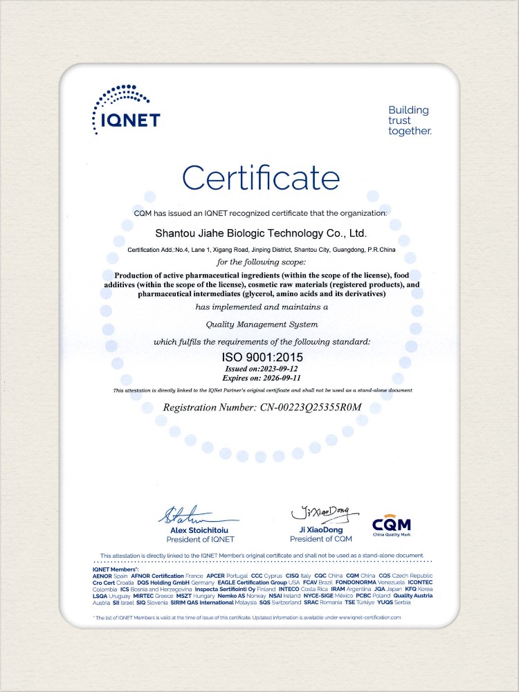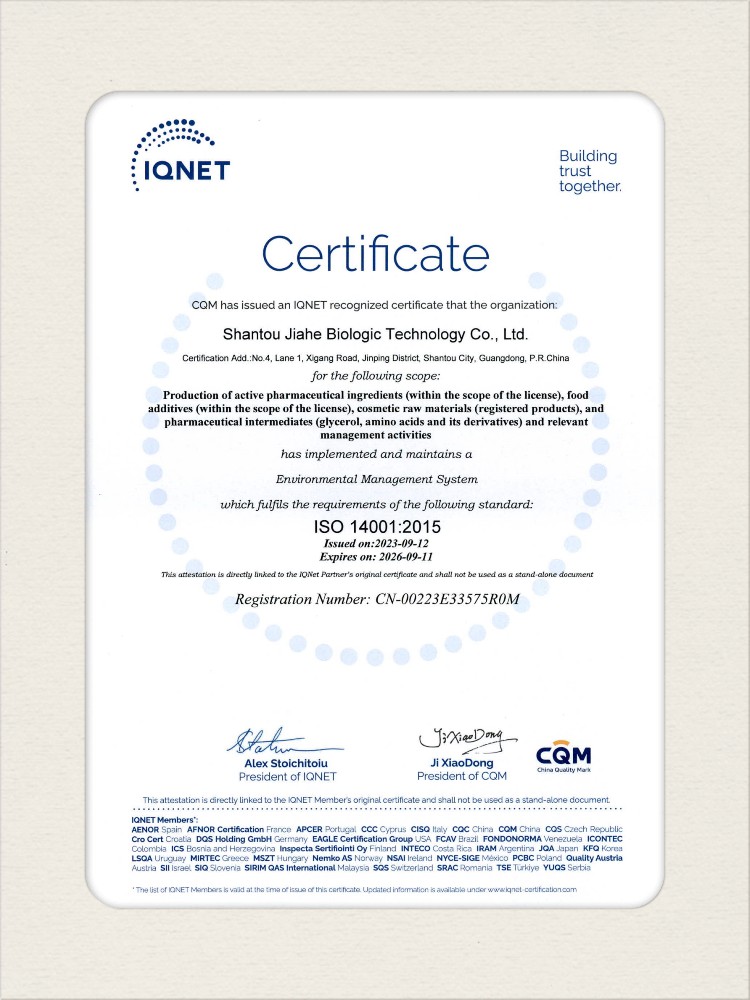 汕頭佳禾生物科技有限公司是一家致力于氨基酸及其衍生物研發(fā)、生產和銷售的國家高新技術企業,先后通過了國家藥品GMP認證,ISO9001質量體系認證、ISO14001環(huán)境管理體系認證。目前,公司擁有“廣東省專精特新中小企業”、“廣東省氨基酸產品工程技術研究中心”、“汕頭市生物發(fā)酵工程技術研究開發(fā)中心”、“汕頭市知識產權優(yōu)勢企業”、“多項國家發(fā)明專利”、“廣東省守合同重信用企業”等多項資質和榮譽,旗下“佳禾牌”系列產品已成為原料藥行業知名品牌。 新泰市佳禾生物科技有限公司成立于2012年8月,注冊資金2億元,公司位于山東泰安新泰市新汶工業園區,是國 家級高新技術企業、山東省“專精特新”企業、山東省制造業單項冠軍企業、泰安市科技型中小企業、泰安市農業產業化龍頭企業、中國生物發(fā)酵產業協會理事單位。